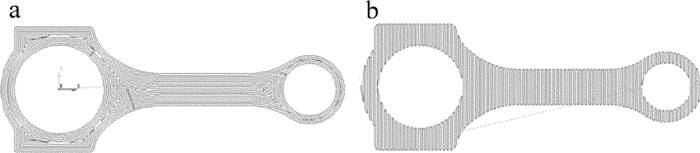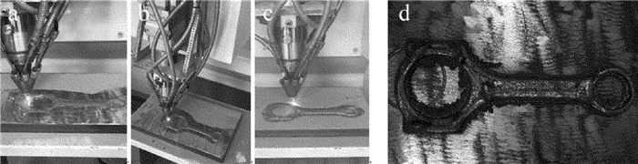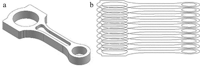 In order to study the manufacturing process of laser 3-D printing for automobile engine connecting rods, by means of theoretical analysis and experimental verification, 3-D model of a connecting rod was established and slicing was done. By S-type scanning and contour offset scanning, two machining paths of connecting rods were planned. Alloy powders based on iron and the corresponding technological parameters were selected to carry out the rod print test in a laser 3-D printing system. It took 4min30s~4min56s to scanning a single layer and it took 4h20min totally. The results show that the metallographic structure at the bottom of the forming zone of the connecting rod is mainly columnar crystal and dendritic crystal. The middle and upper part are small equiaxed crystal. Interlayer is dense and good metallurgical bonding had been formed. The microhardness of the formed connecting rod is 450HV~490HV, yield strength is 754MPa, tensile strength is 1189MPa, and elongation rate was 9%. Compared to forging, powder forging manufacturing processes, laser 3-D printing forming reduces tooling costs and shortens the production preparation time. Its mechanical properties, such as yield strength and tensile strength, exceed those of steel forging links. Compared with foreign powder forged connecting rod, the difference is not very big. The process can meet the requirements of connecting rod blank making.